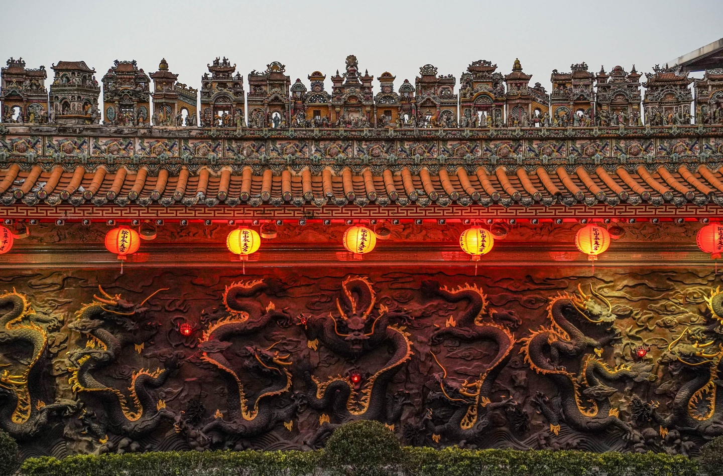 廟埕牆上雙龍搶珠之石雕,盡顯端莊