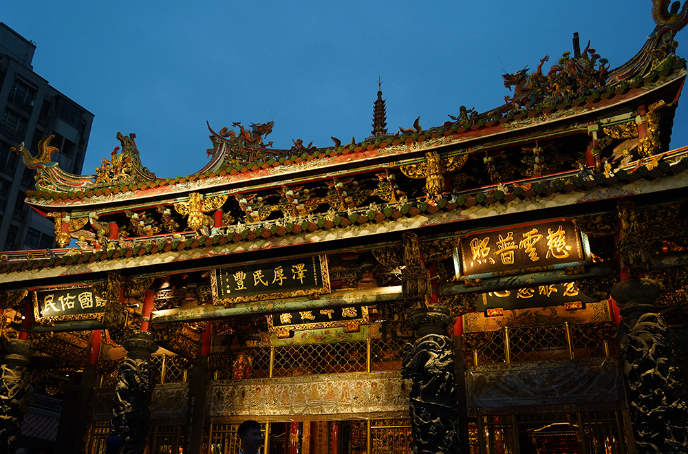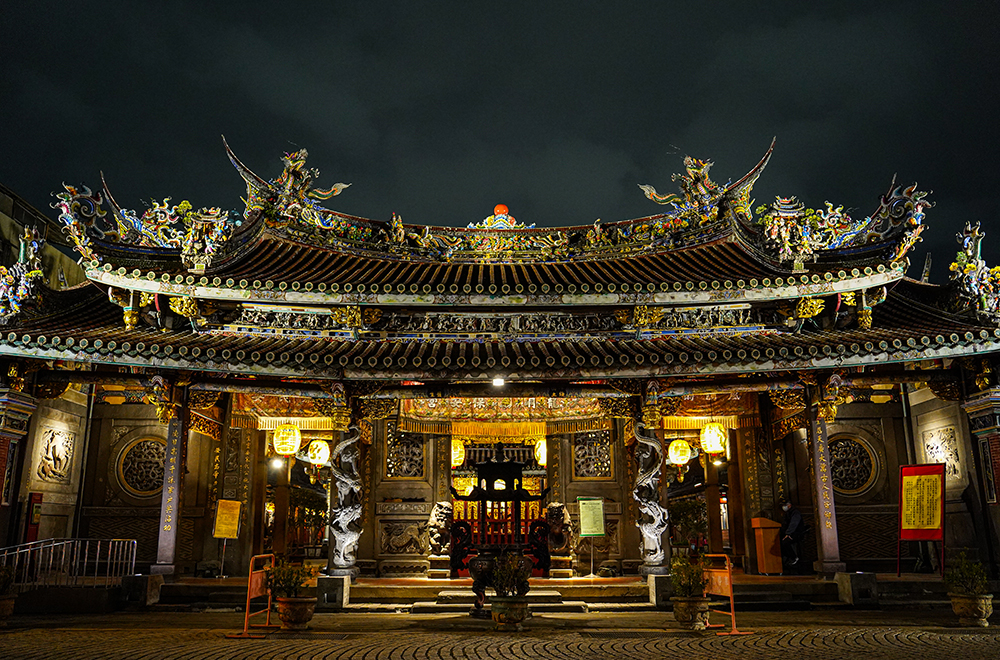 主祀觀音佛祖的艋舺龍山寺,坐北朝南,面呈回字形,整體建築包括石雕、木雕、彩繪和格局樣貌展現傳統廟宇精緻之美,亦深具文化藝術價值,現為國定古蹟。