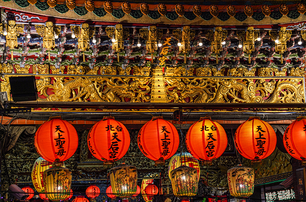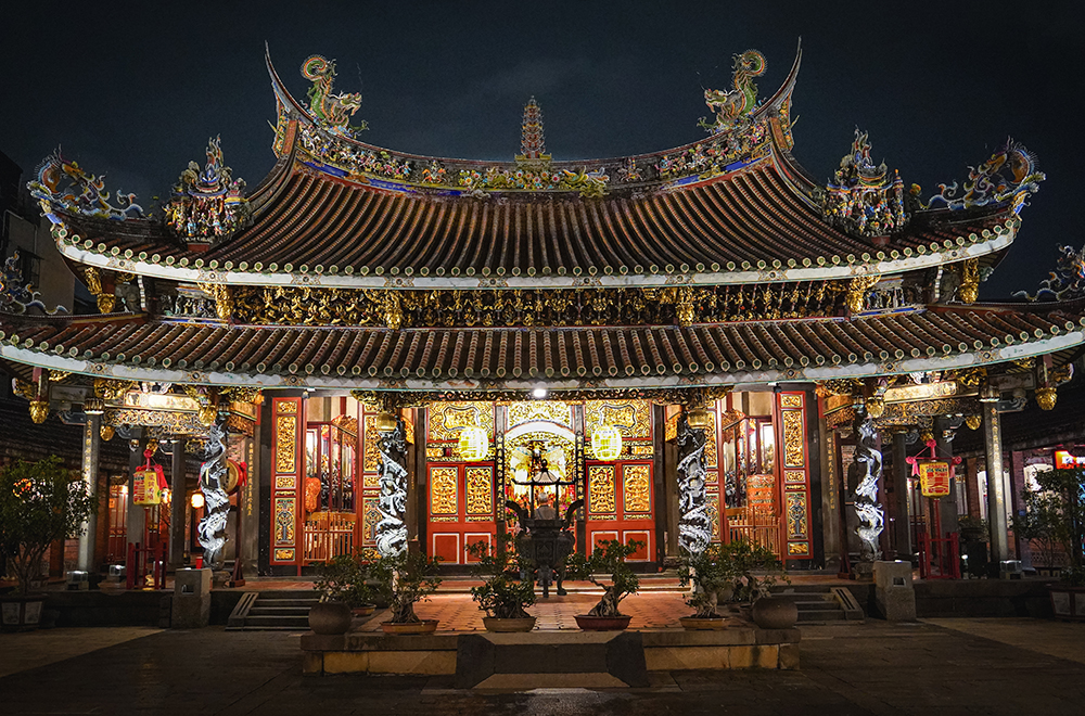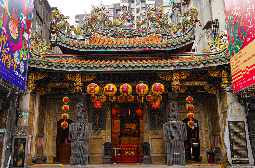 主祀觀音佛祖的艋舺龍山寺,坐北朝南,面呈回字形,整體建築包括石雕、木雕、彩繪和格局樣貌展現傳統廟宇精緻之美,亦深具文化藝術價值,現為國定古蹟。