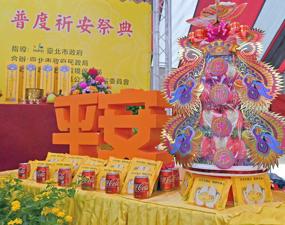 每年臺灣省城隍廟在籌備中元普度祈安祭典上,都花費許多心思,在贊普桌上不僅有巧奪天工的看牲及各式佛教法意擺設,蘊含祈福平安、消災解厄的涵意外,也會發揮巧思將平安米堆疊設計成如八卦、法輪、卍字等圖像外,近年普度現場更設有大型的平安米寶船及精緻的花束冰雕及果雕,結合傳統與文創,以虔誠的心祈求臺北市風調雨順、國泰民安,也讓參與祭典的信眾們眼睛為之一亮。